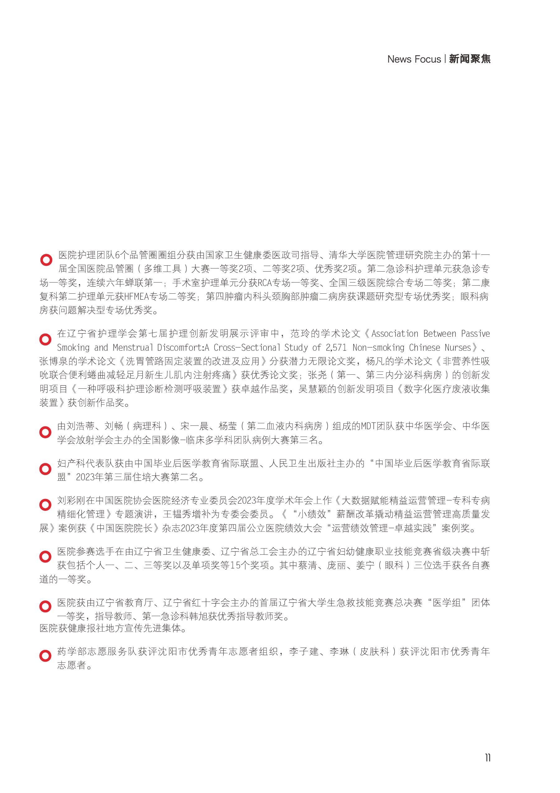 01 封面 02 李乐成到中国医科大学讲授思政课并调研 03 李乐成到中国医科大学讲授思政课并调研 04 省领导赴沈阳辽阳走访慰问一线医务人员 05 医院举办“未来人才系列论坛”及“国家级项目申报”专题讲座 06 医院统筹院内资源 全力做好患儿医疗救治工作 07 西藏自治区那曲市委副书记、常务副市长于国强一行来院调研交流//中国医科大学科研管理工作说明会在院召开 08 团委举办“书香沈阳 青春悦读”读书分享会//俞梦孙院士来院调研“束波刀”临床试验项目 09 医院通过辽宁省生物安全人才培训项目验收//医院举办2023年辽宁省住院医师规范化培训儿科专业骨干师资培训班 10 光荣榜 11 光荣榜 12 医院完成专科医师规范化培训结业考核工作//护理部召开护理科研诚信管理工作会议 13 医院生殖健康与遗传医学重点实验室通过国家卫生健康委评估期验收//吴琪俊团队通过蛋白质组学揭示上皮性卵巢癌分子特征和治疗靶点,并在Nature子刊上发表研究论文 14 医院举办“临床研究设计与实施经验分享”系列讲座//医院举办辽宁省免疫学会呼吸免疫分会第三届学术会议 15 医院举办2023年中国药师协会药物治疗管理工作委员会学术年会//医院举办2023盛京肿瘤转化医学会议 16 医院举办2023辽宁省耳鼻咽喉头颈外科微创手术会议//医院举办东北三省第十二届小儿外科学术研讨会 17 辽宁省细胞生物学学会领导莅临医院第七骨科骨与软组织肿瘤科调研指导//医院举办2023辽宁省超声医学质控中心年会 18 第三骨科 手足踝显微外科病房完成两例高难度手术 19 医院驻宝马公司医护人员抢救一名突发心脏骤停患者 20 爱心接力成功救治昏迷患儿 21 爱心接力成功救治昏迷患儿 22 2023,作风建设不松劲! 23 简明新闻 24 封底