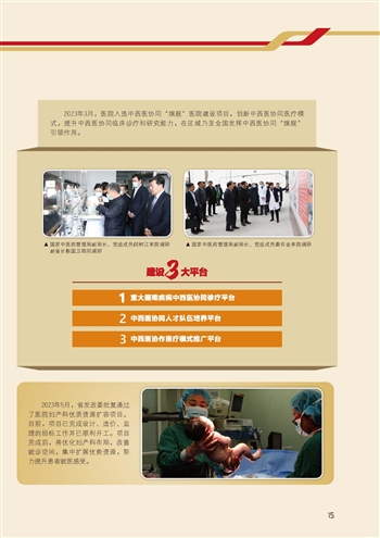 2023年3月,医院入选中西医协同“旗舰”医院建设项目,创新中西医协同医疗模式,提升中西医协同临床诊疗和研究能力,在区域乃至全国发挥中西医协同“旗舰”引领作用。