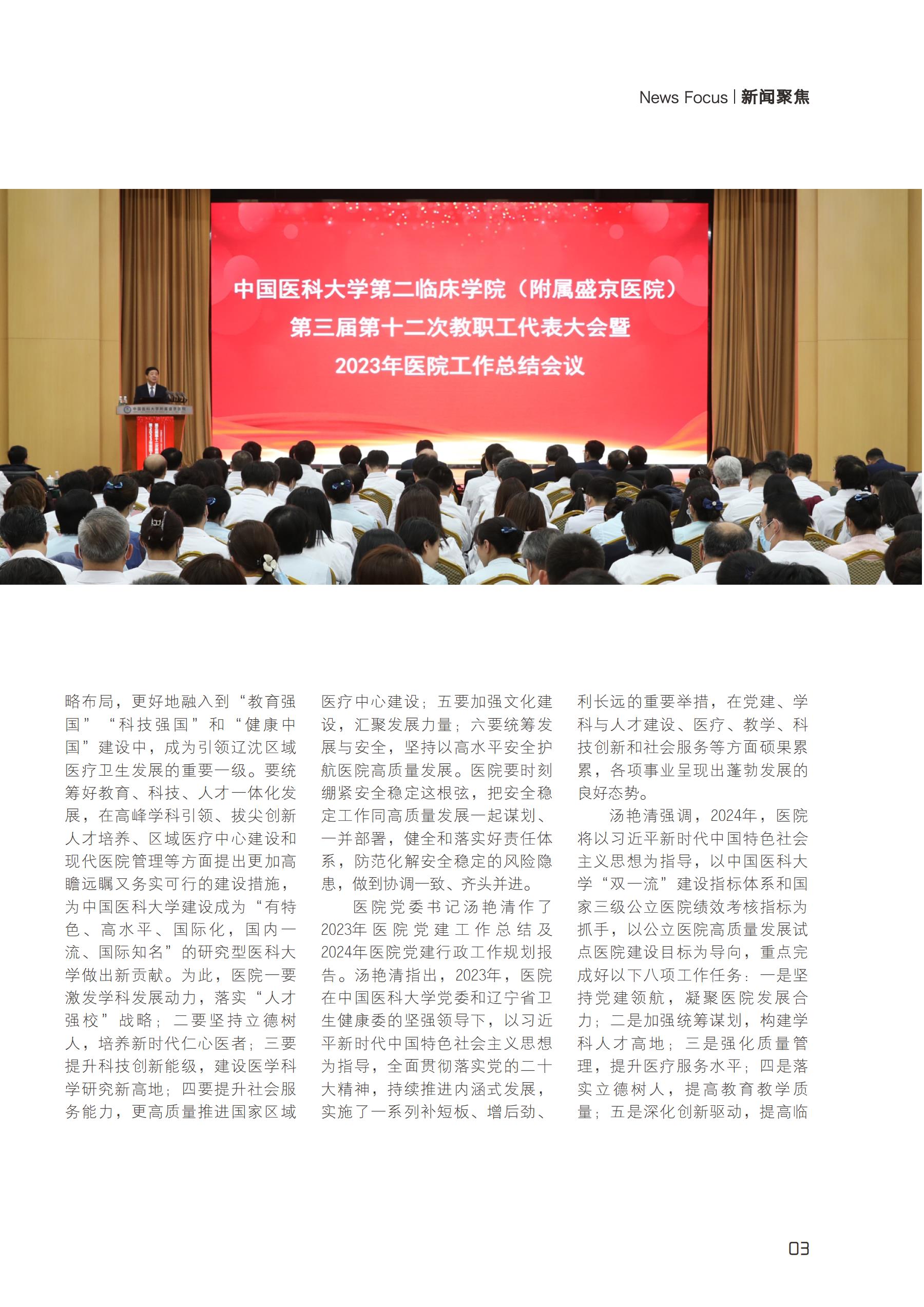 01 封面 02 医院召开第三届第十二次教职工代表大会暨2023年医院工作总结会议 03 医院召开第三届第十二次教职工代表大会暨2023年医院工作总结会议 04 医院召开第三届第十二次教职工代表大会暨2023年医院工作总结会议 05 沈阳市副市长,沈阳市公安局党委书记、局长王会奇来院督导检查节前安全生产工作//医院开展节前安全生产检查 06 医院召开党委理论学习中心组专题学习会议 07 党建工作与中心工作深度融合推动医院高质量发展 医院召开2023年度总支书记抓党建述职评议会//光荣榜 08 医院召开医疗、科研教学、护理2023年工作总结暨2024年工作部署会议 09 医院召开医疗、科研教学、护理2023年工作总结暨2024年工作部署会议 10 医院召开医疗、科研教学、护理2023年工作总结暨2024年工作部署会议//医院多科室召开2023年工作总结暨2024年工作部署会议 11 医院举行“春暖盛京”2024龙年春节联欢会 12 医院举行“春暖盛京”2024龙年春节联欢会 13 医院开展春节前走访慰问//医院举办2023级非规培研究生岗前培训//辽宁省书法家协会文艺志愿服务活动在院举办 14 医院举办辽宁省肿瘤中医药多学科交叉创新团队成立启动会//李达团队合作成果揭示哺乳动物生命起始时期脂代谢重塑全景并在Nature子刊上发表研究论文 15 国际尖端放疗利器TOMO Radixact在院正式开机启用 16 医院第三心血管内科病房为两名高龄且极高危重度主动脉瓣狭窄患者实施极简式经导管主动脉瓣置换(TAVR)手术 17 医院开展骶骨高位脊索瘤全骶骨切除、3D打印肿瘤型全骶骨人工假体置换术 18 十佳临床科主任获奖感言 19 十佳临床科主任获奖感言 20 2023年度十大反腐热词 21 2023年度十大反腐热词 22 盛京医保专栏之答医生问 第8季 23 盛京医保专栏之答医生问 第8季 24 封底