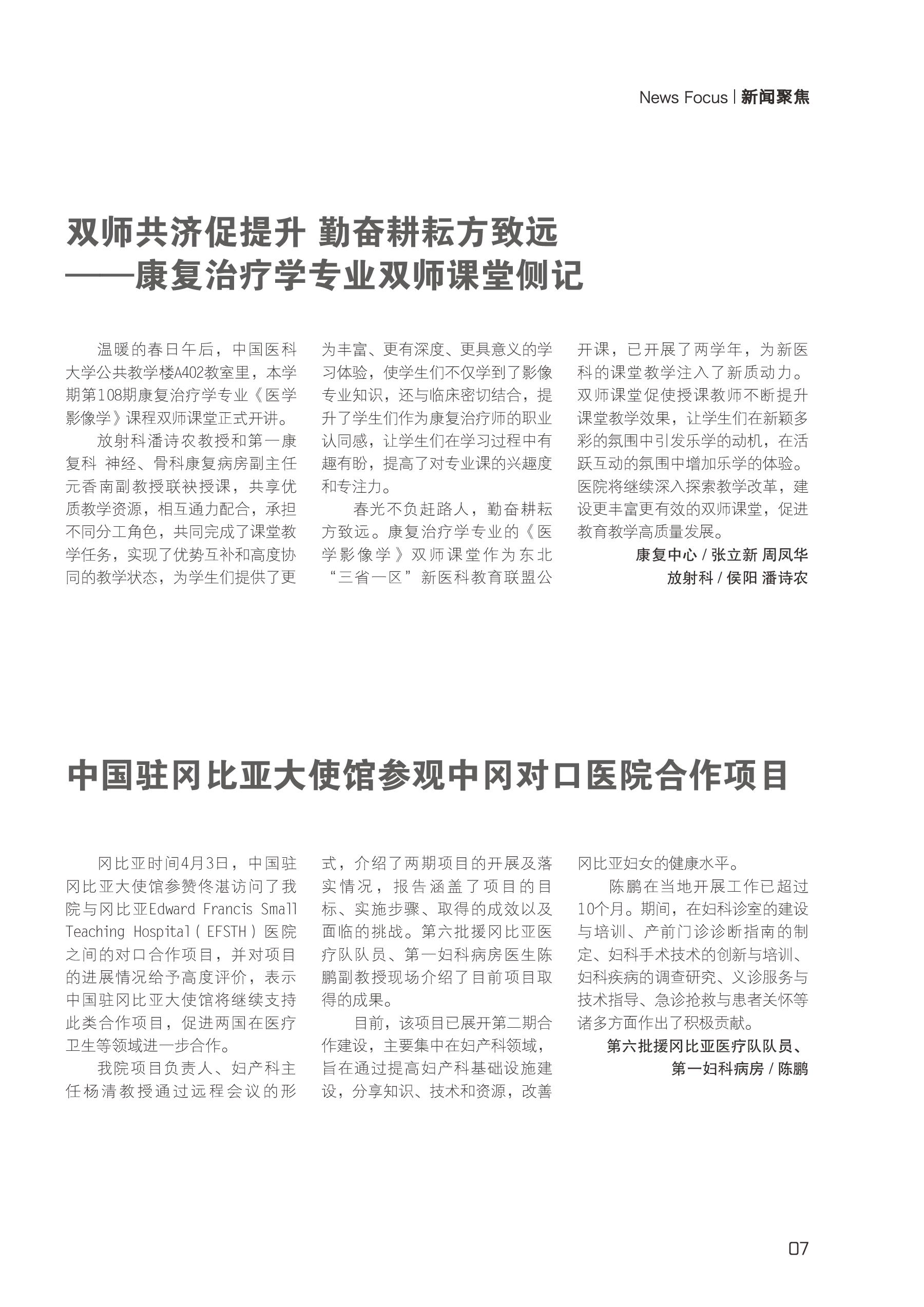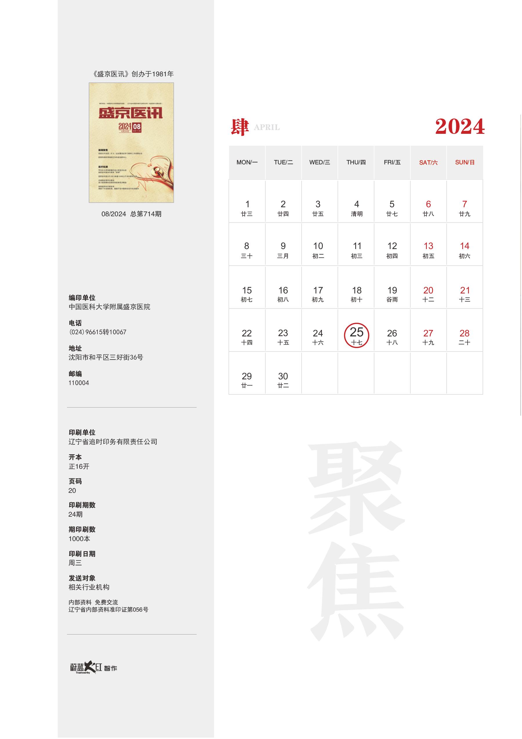 01 封面 02 扉页 03 医院召开党委(扩大)会议暨党纪学习教育工作部署会议 04 医院召开党委(扩大)会议暨党纪学习教育工作部署会议 05 院领导调研滑翔院区和科技创新中心//海南省万宁市人民政府副市长沈德安一行来院考察交流 06 医院举办科研诚信专题讲座//盛京肾脏专科联盟成立暨授匾仪式在院举办 07 内蒙古自治区赤峰市卫生健康委领导来院交流座谈//第五妇科病房在滑翔院区成立 08 医院召开住培专业基地负责人工作会议//光荣榜 09 双师共济促提升 勤奋耕耘方致远——康复治疗学专业双师课堂侧记//中国驻冈比亚大使馆参观中冈对口医院合作项目 10 罕见巨大恶性肿瘤压迫心肺危及生命 医院多科室协作精准“拆弹” 11 罕见巨大恶性肿瘤压迫心肺危及生命 医院多科室协作精准“拆弹” 12 医院多科室合作 助力体重150余公斤孕妇顺利剖娩 13 沈城高校留学生联动助力医院稀有血型抗体患者成功输血//新闻 14 医院超声科开展多例局麻下子宫腺肌病、腹壁子宫内膜异位症冷冻消融术 15 医院超声科开展多例局麻下子宫腺肌病、腹壁子宫内膜异位症冷冻消融术 16 简明新闻//医院举办义诊、宣教活动 17 医院举办义诊、宣教活动 18 二十届中央纪委三次全会公报 19 基金监管同参与 守好群众“救命钱” 20 封底