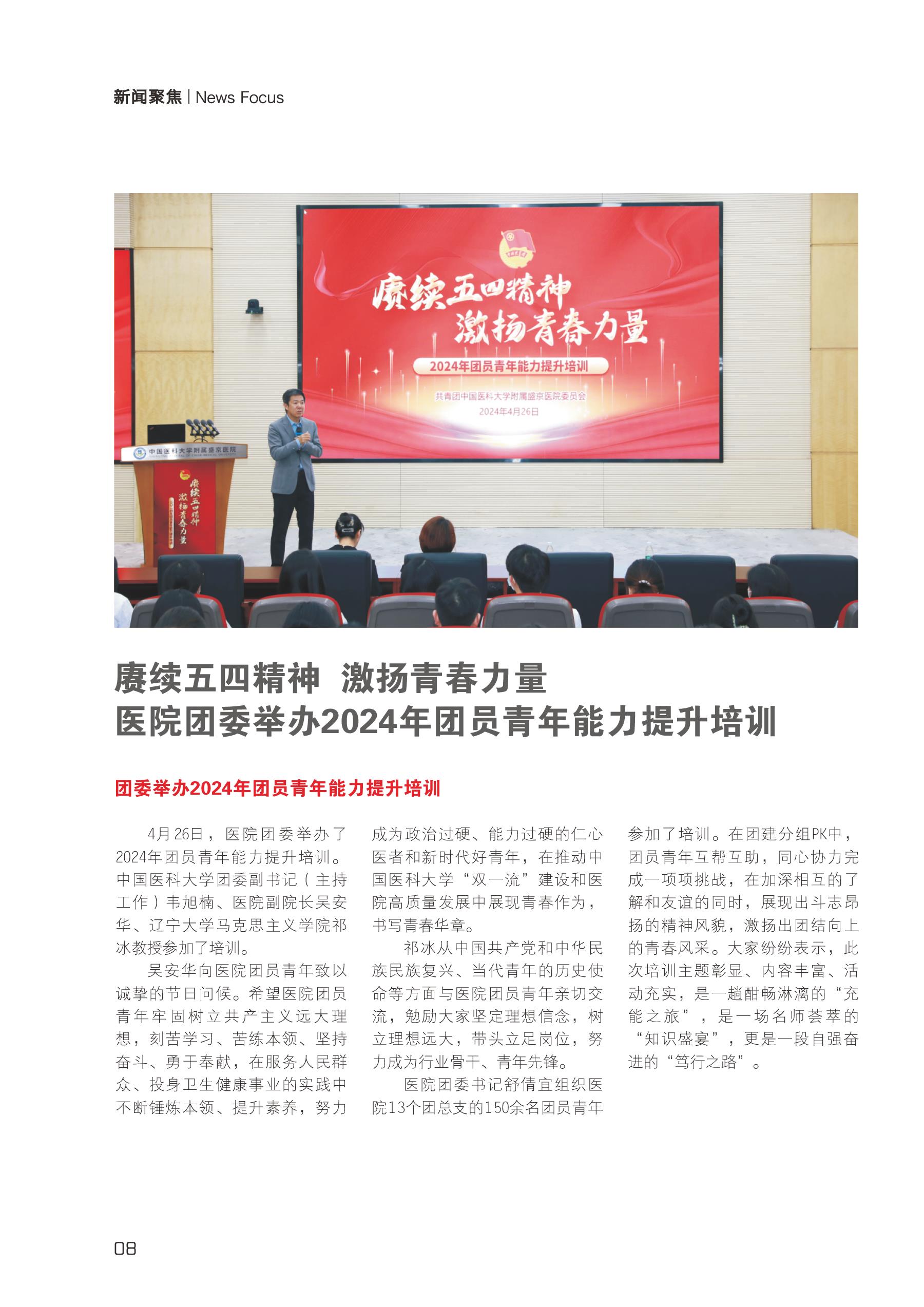01 封面 02 扉页 03 医院党委举办党纪学习教育第1期读书班暨党委理论学习中心组(扩大)学习会 04 医院党委举办党纪学习教育第1期读书班暨党委理论学习中心组(扩大)学习会 05 医院开展安全生产检查 06 王以政院士来院作科研学术讲座 07 医院举办2024年春季悦跑、健步走活动 08 医院举办医保基金监管宣传月主题活动 09 医院举办2024年第一期行风警示教育培训//光荣榜 10 赓续五四精神 激扬青春力量 医院团委举办2024年团员青年能力提升培训 11 赓续五四精神 激扬青春力量 医院团委举办2024年团员青年能力提升培训 12 泰国提拉姆维特帕塔纳高中师生来院参观交流//医院举办2024年医疗新技术立项评审答辩会//医院召开麻醉科围手术期麻醉药品、精神药品管理沟通会 13 医院举办2024年住院MDT团队申报评审会//医院举办第二期盛京GICU重症培训班 14 第一神经外科病房完成脑深部电刺激植物人促醒手术 15 第四胸外科病房联合麻醉科完成一例保留自主呼吸非气管内插管麻醉下单孔电视胸腔镜下肺大疱切除术 16 第一泌尿外科病房开展前列腺局灶治疗新技术“精准治瘤”和“功能保护”实现兼得 17 第一泌尿外科病房开展前列腺局灶治疗新技术“精准治瘤”和“功能保护”实现兼得 18 小儿心脏病科携手第三心血管内科病房救治一名炎症性心肌病患儿 19 简明新闻 20 封底