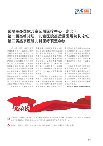 5月18日、19日,在辽宁省卫生健康委指导下,由医院、国家儿童区域医疗中心(东北)、北京恒济卫生管理发展基金会联合主办,辽宁省生命科学学会协办的国家儿童区域医疗中心(东北)第二届高峰论坛、儿童医院高质量发展院长论坛、第三届盛京医院儿科医疗联盟会议在沈举办。中华医学会儿科学分会主任委员王天有,辽宁省卫生健康委医政处处长李鹏,中国医科大学党委常委、医院党委书记汤艳清,医院副院长、中国医科大学儿童医院院长许巍参会并讲话。