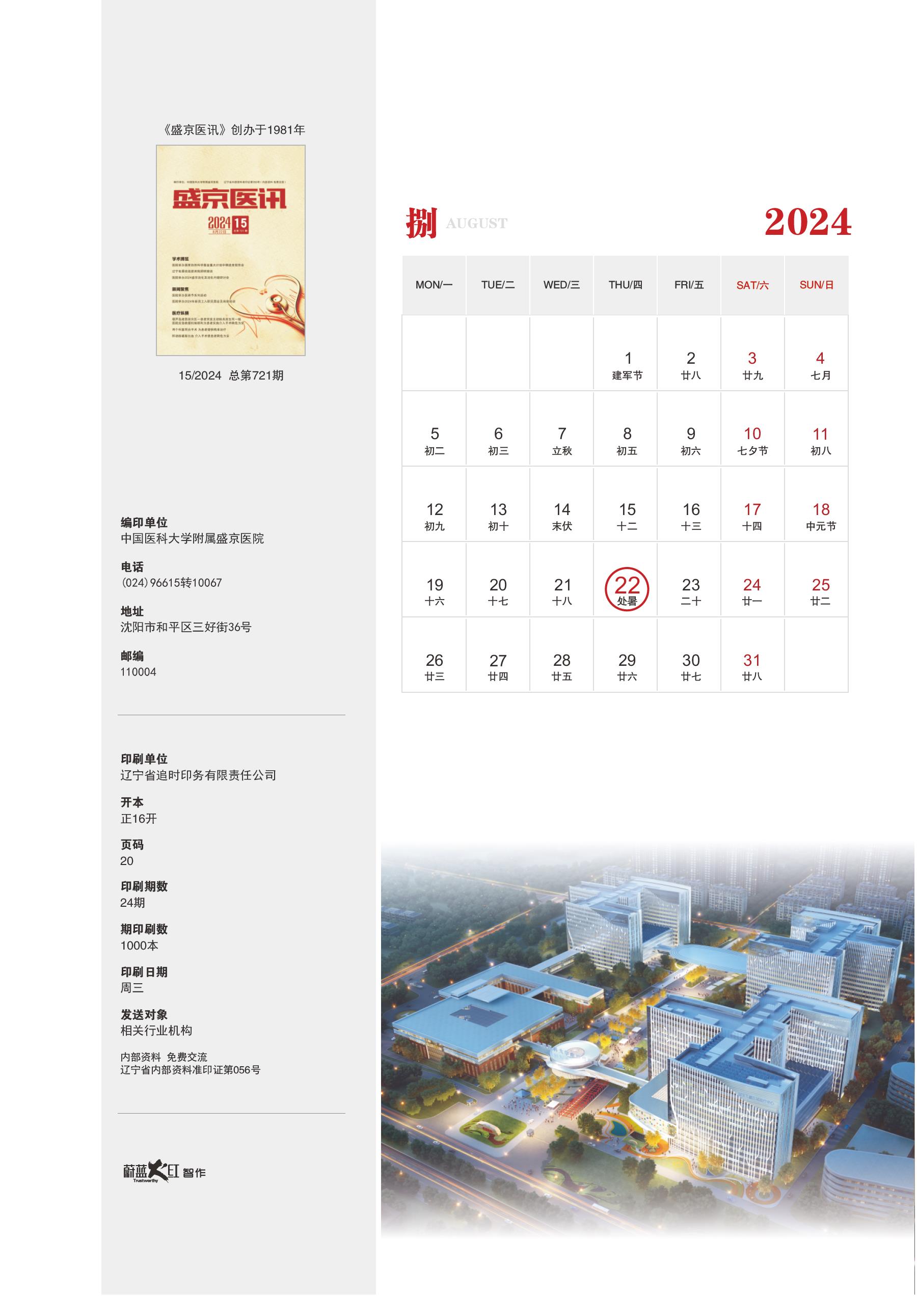 01 封面 02 扉页 03 医院举办国家自然科学基金重大计划中期进度报告会 04 辽宁省委统战部来院调研座谈 05 医院举办2024盛京消化及消化内镜研讨会 06 致敬医者 情暖人心 医院举办医师节系列活动 07 致敬医者 情暖人心 医院举办医师节系列活动 08 致敬医者 情暖人心 医院举办医师节系列活动 09 致敬医者 情暖人心 医院举办医师节系列活动 10 医院举办2024年新员工入职见面会及岗前培训//院领导走访慰问华晨宝马大东工厂医疗诊所医务人员 11 中国医科大学科技开发公司与医院房屋产权交接仪式在院举行//辽宁省市场监督管理局检查组来院召开医疗服务价格收费检查进点部署会//院领导赴青海、新疆慰问援助队员 12 医院完成辽宁省卫生健康委新疆塔城地区人民医院行政科室骨干管理培训工作//辽宁省疾病预防控制中心调研组来院调研心脑血管事件发病报告工作 13 辽宁省卫生健康委安全生产检查组来院检查安全生产工作//医院举办第十届辽宁创伤骨科精英论坛年会//光荣榜 14 医院抗洪医疗救援队出发 驰援葫芦岛建昌县//简讯 15 葫芦岛建昌县灾区一患者突发主动脉夹层生死一线 医院应急救援机制顺利为患者实施介入手术转危为安 16 两个科室同台手术 为患者提供精准治疗 17 肝动脉破裂出血 介入手术使患者转危为安//简明新闻 18 监控拍下惊险一幕!18岁女孩突然倒地!沈阳医生跪地救人! 19 监控拍下惊险一幕!18岁女孩突然倒地!沈阳医生跪地救人! 20 封底